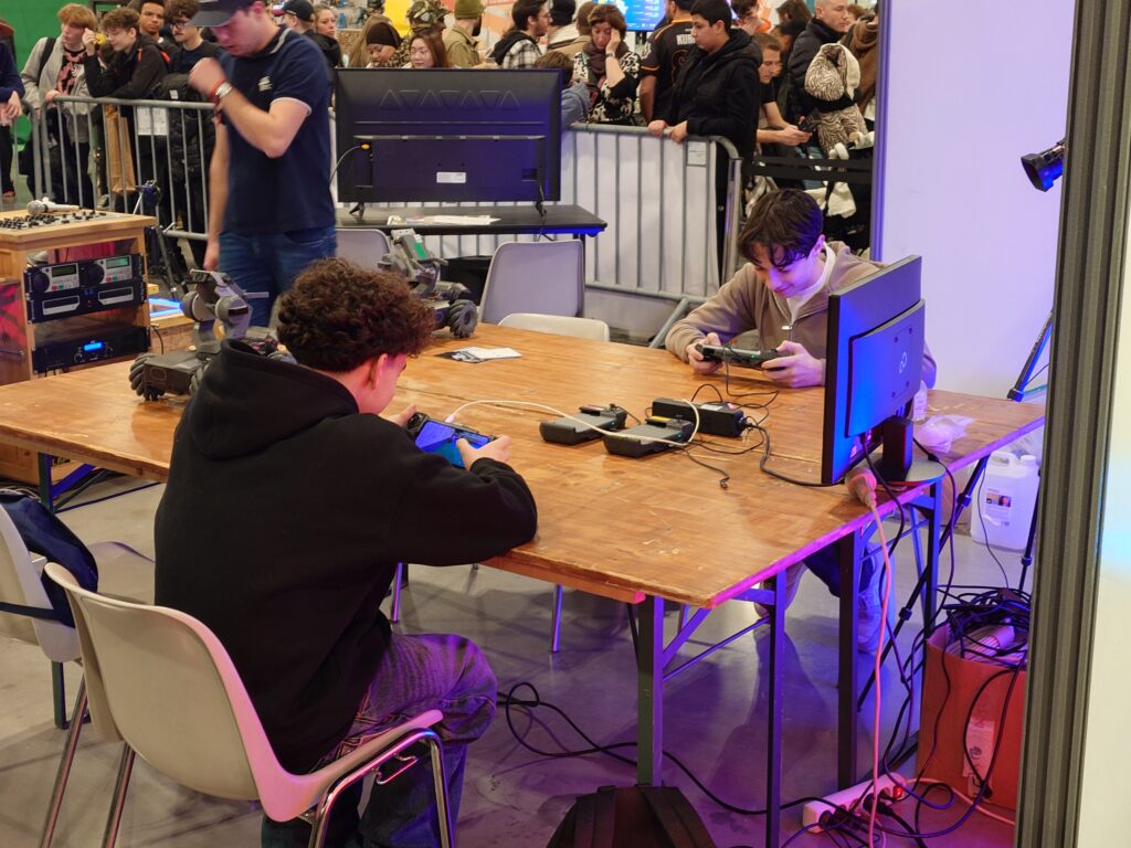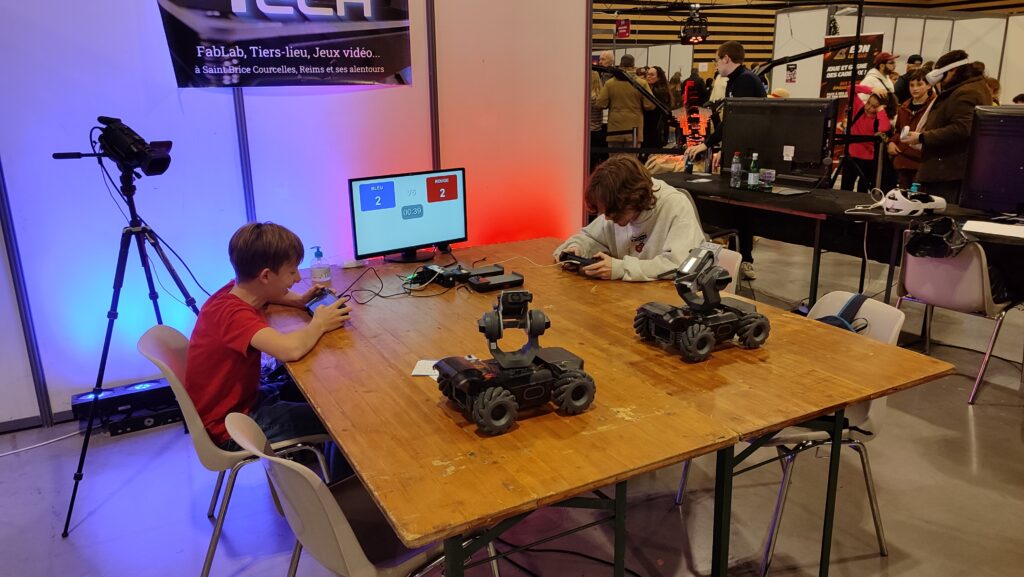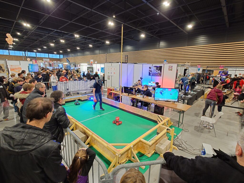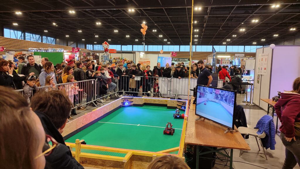 Cette année, c’est sur un stand de 110m² que nous présentions nos activités : une partie Fablab, un espace Réalité Virtuelle ainsi que notre évènement principal : le Robot Foot Battle.